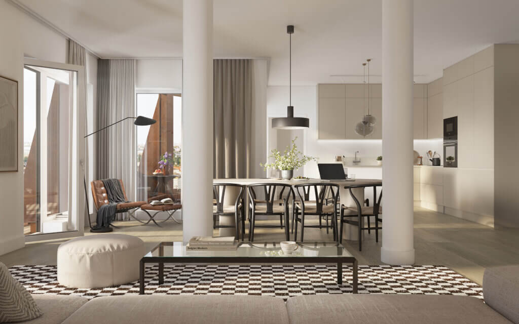 Bostäderna är smakfullt inredda med exklusiva detaljer i jordnära toner. De sobra ekgolven och exklusiva bänkskivorna i marmor harmonierar perfekt med det oslagbara ljusinsläppet som bara kan upplevas på dina nya höjder. Materialvalen är omsorgsfullt utvalda, perfekt för den medvetna köparen som söker efter det lilla extra.